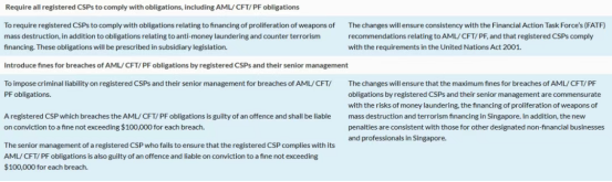 图片来源:新加坡会计与企业管理局(ACRA) 2、强化 AML/CFT/PF 监管 具体要求:注册 CSP 及其高管需严格遵守反洗钱及防扩散义务,违规将追究刑事责任。 违规处罚:每次违规最高罚 10 万新元。