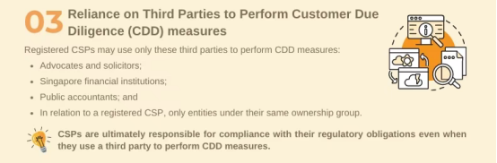 图片来源:新加坡会计与企业管理局(ACRA) 3、第三方尽职调查:仅限指定“白名单” 机构 CSP 仅可委托以下第三方执行客户尽职调查(CDD): ·新加坡执业律师或律师事务所; ·本地金融机构(如银行、保险公司); ·公共会计师; ·同一所有权集团内的关联实体。 注:即使委托第三方,CSP 仍需对尽职调查结果负最终合规责任,不可转嫁义务。