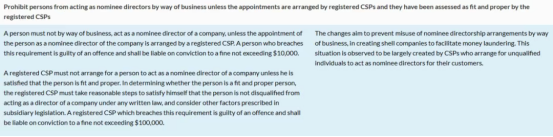 图片来源:新加坡会计与企业管理局(ACRA) 3、提名董事独家代理权 具体要求:仅注册 CSP 可安排提名董事,其他机构或个人不得商业化担任该职位。 违规处罚:个人违规最高罚 1 万新元,CSP 违规最高罚 10 万新元。