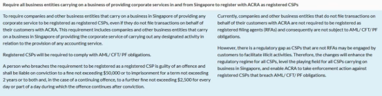 图片来源:新加坡会计与企业管理局(ACRA) 二、新规五大核心变化解读 1、全行业 CSP 注册制 具体要求:所有在新提供企业服务的公司必须在 ACRA 注册为 CSP,履行反洗钱(AML)、反恐怖融资(CFT)等义务。 违规处罚:最高 5 万新元罚款或 2 年监禁,累犯每日加罚 2500 新元。