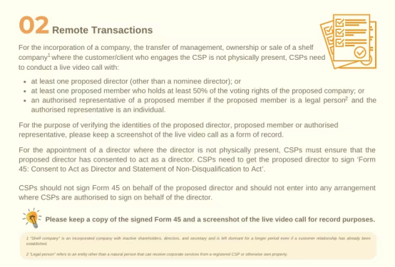 图片来源:新加坡会计与企业管理局(ACRA) 2、远程交易:视频核验成为硬性要求 对于公司的成立、管理权的转让、所有权的转移或空壳公司*的出售,如果参与CSP的客户不在场,CSP需要与以下人员进行实时视频通话: ·至少一名拟定董事*(提名董事除外);或 ·至少一名持有拟定公司*至少50%投票权的拟定成员*;或 ·拟定成员的授权代表,如果拟定成员是法人*,授权代表是个人。 为核实拟定董事、拟定成员或授权代表的身份,请保留现场视频通话的截图作为记录。对于董事未亲自出席的董事任命,CSP必须确保拟定董事已同意担任董事。 操作要点: 留存视频通话截图作为合规记录; 董事任命需由本人签署《Form 45:同意担任董事及无资格取消声明》,禁止 CSP 代签; 空壳公司(长期休眠的法人实体)交易需额外关注身份真实性。